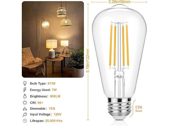 In the Box: (1) Vintage LED Edison Bulbs 60 Watt Equivalent Dimmable 7W ST58 LED Filament Light Bulbs Warm White 3000K Antique Style Lighting High Brightness 800LM E26 Medium Base Clear Glass for Home Office, 12 Pack