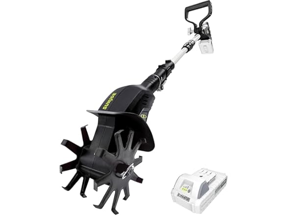 THE DIRTY LITTLE SECRET OF GREAT GARDENERS! Put the back-breaking work of tilling tough turf behind you and break some ground with the power-packed 24-Volt Cordless Tiller Cultivator from SUN JOE! Powered by revolutionary IONMAX lithium-ion technology, 24V-TLR’s 24-Volt 2.0-Ah battery provides rechargeable runtime with no-fade power + performance, and cord-free, gas-free, rechargeable power! The perfect power weeder, SUN JOE effortlessly slices away weeds and loosens soil to allow air and moisture to penetrate for healthier roots and plants. Go where no tiller has gone before with the dual 6-inch tilling blades! 10 durable, steel tilling prongs easily cultivate in tight or cramped quarters — even in between plants — for maximum maneuverability and performance. Lightweight at just 6 lbs, 24V-TLR features a telescopic pole — which extends up to 37 inches — and an adjustable auxiliary handle, to take the pain and strain out of yard chores! So, keep your yard looking its best, with less stress. Go With Joe®: 24V-TLR-LTE 24-Volt Cordless Tiller Cultivator from SUN JOE®. GET EQUIPPED®.