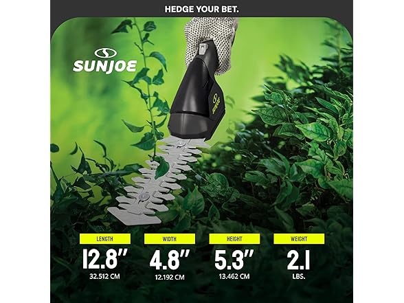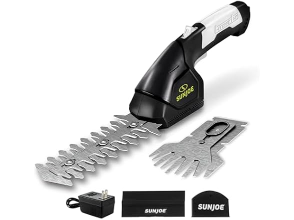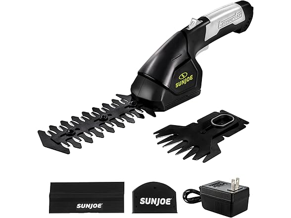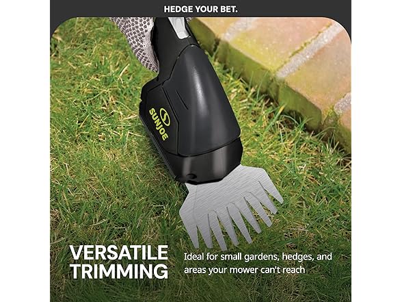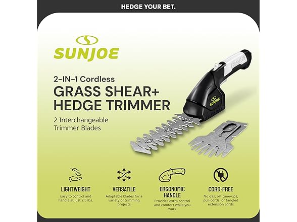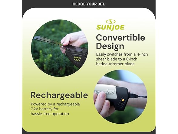 The Sun Joe HJ604C cordless handheld trimmer is a versatile, lightweight tool perfect for small gardens and tight spaces. This trimmer is powered by a 7.2-volt rechargeable lithium-ion battery for extra efficiency and weighs only 2.5 lbs. It also features an ergonomic handle, making it an ideal, lightweight solution for homeowners looking for a hassle-free lawn grooming tool. This 2-in-1 tool easily converts from 4-inch grass shear blades to a 6-inch hedge trimmer with the quick switch of a blade, making it perfect for grooming lawns, trimming edges, and tidying up areas your mower can’t reach. The durable, interchangeable steel blades offer long-lasting performance and reliability. Whether you’re shaping hedges or maintaining grass around walkways, this tool provides precision and efficiency in a compact design. Keep your lawn and garden lush and green with Sun Joe! Our robust line of washers, trimmers, leaf blowers, and other lawn-maintenance tools can suit all kinds of properties and are designed to keep your outdoor oasis in tip-top shape year after year. Joe brands design, manufacture, and market a wide range of innovative, high-quality tools for the home, yard, garden, and garage. We are dedicated to purpose-driven solutions that put people first. We strive to offer the right tool for every household, making it easy to Go with Joe to get the job done.