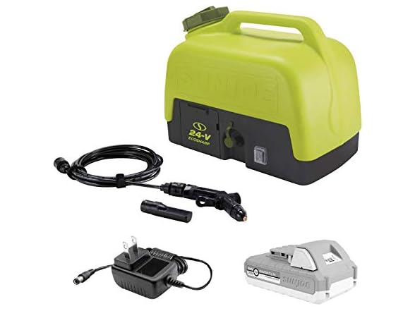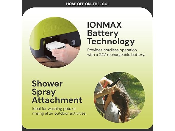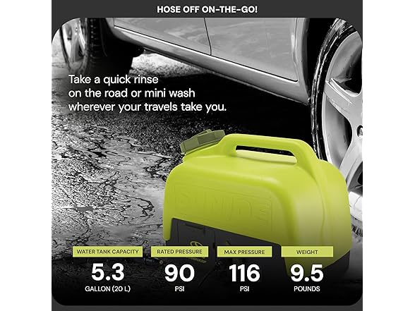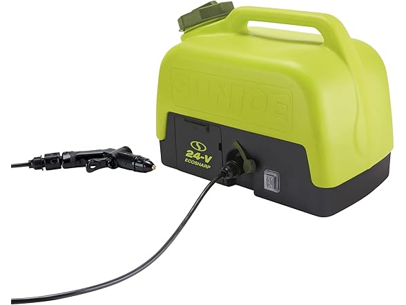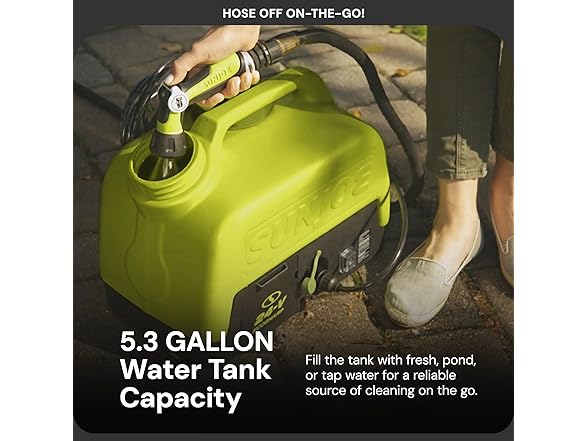 Hose off on-the-go! Take a quick rinse on the road or mini wash wherever your travels take you with the new WA24C-LTE powered cordless portable spray washer from Sun Joe. Only the premium ion technology gives you room to roam, courtesy of the powerful, 24V Rechargeable lithium-ion battery. This perfectly portable sprayer is ideal for quick outdoor cleanups at the campsite, cabin, car, beach & boat, or anywhere power is at a premium. Fill up fast to carry up to 5 gallon of fresh, pond, or tap water & Wash away dirt & debris with the 38 Min runtime! The included spray attachment provides an on-the-go washing station wherever a quick rinse is needed. Simply twist wa24c-lte’s nozzle to adjust — from pinpoint jet stream to gentle fan spray. & when you need more power, just plug in & recharge the 24V battery.