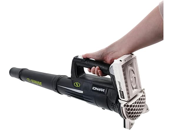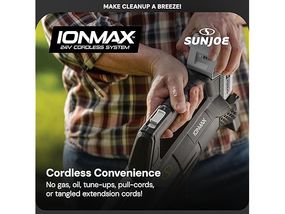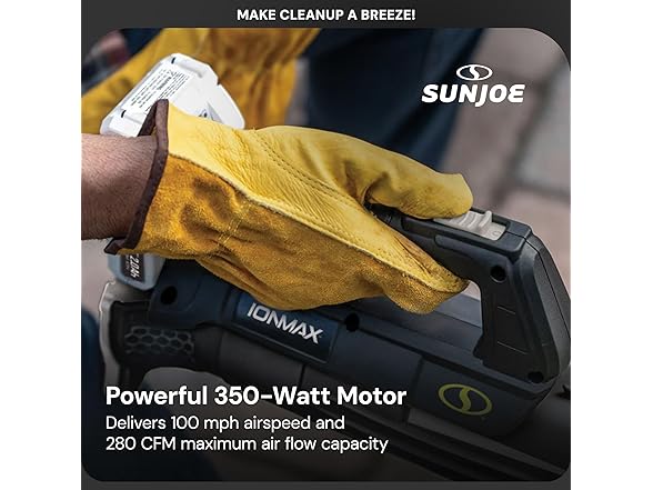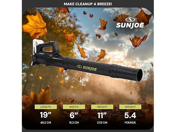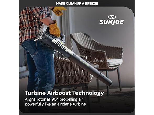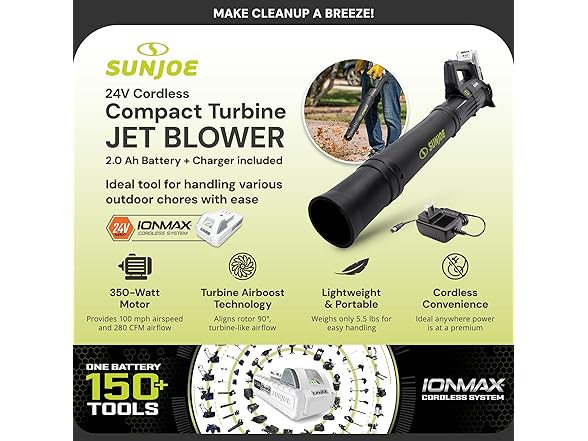 The Sun Joe 24-Volt IONMAX Jet Leaf Blower is the ultimate solution for quick, efficient cleanups with the convenience of cordless freedom. Lightweight at just 4 lbs, this compact blower offers easy handling and exceptional power in one sleek package. Powered by Sun Joe's advanced 24-Volt IONMAX system, the included 2.0 Ah lithium-ion battery provides up to 12 minutes of continuous runtime, clearing away leaves, dirt, debris, and even light snow. Thanks to the Quick Charger, the battery recharges in only 5 hours, ensuring you're ready for your next task in no time. The powerful 350-watt motor generates a remarkable 100 mph airspeed and up to 280 CFM of airflow, delivering the performance you need for swift, effective cleanups on your porch, patio, deck, walkway, or garage. The innovative Turbine AirBoost Technology aligns the rotor at a 90-degree angle, allowing air to be propelled forward with more force, similar to the turbine jet engine of an airplane. This design maximizes efficiency, making the Sun Joe Jet Leaf Blower an ideal tool for handling various outdoor chores with ease. Whether you're maintaining your yard or clearing light debris from your outdoor spaces, the Sun Joe 24-Volt IONMAX Jet Leaf Blower is the perfect combination of power, portability, and convenience. Get yours today and experience the ultimate in cordless, lightweight, and high-performance yard care!