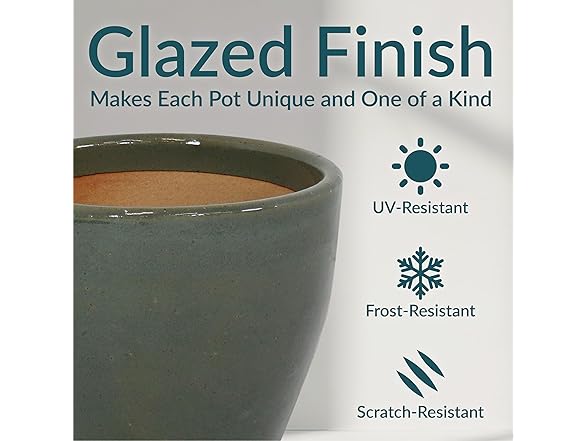 - DESIGNED FOR BEAUTY AND DURABILITY: These ceramic pots are crafted with a rich, hand-painted glazed finish that is kiln-fired for a classic, shining appearance. Subtle variations in color highlight the artisanal glazing process, making each piece truly unique. The durable ceramic construction offers natural UV and frost resistance, while their weight adds stability to outdoor arrangements, keeping the planters upright in windy conditions.