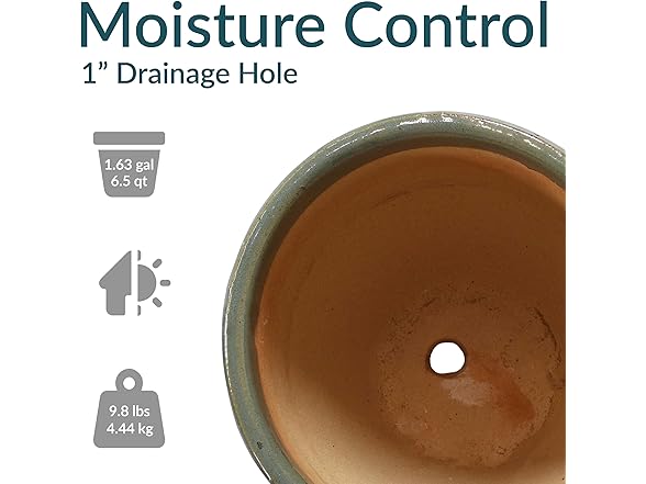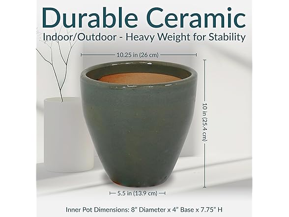 - MEDIUM SIZE FOR GROWING PLANTS: Each ceramic plant pot features a 1.63-gallon soil capacity that provides space for growing small plants, herbs, and flowers. The planters each measure 10.25" outer top diameter (9" inner top diameter) x 5.5" outer base diameter (5" inner base diameter) x 10" H outer (9.5" H inner) and weighs 9.8 lbs. They each have a 1" drainage hole in the bottom.