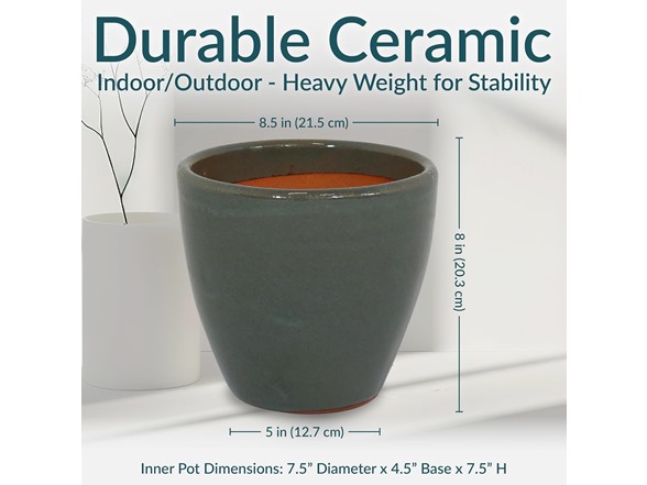 - MEDIUM SIZE FOR GROWING PLANTS: Each ceramic plant pot features a 0.94-gallon soil capacity that provides space for growing small plants, herbs, and flowers. The planters each measure 8.5" outer top diameter (7.5" inner top diameter) x 5" outer base diameter (4.5" inner base diameter) x 8" H outer (7.5" H inner) and weighs 5.8 lbs. They each have a 1" drainage hole in the bottom.