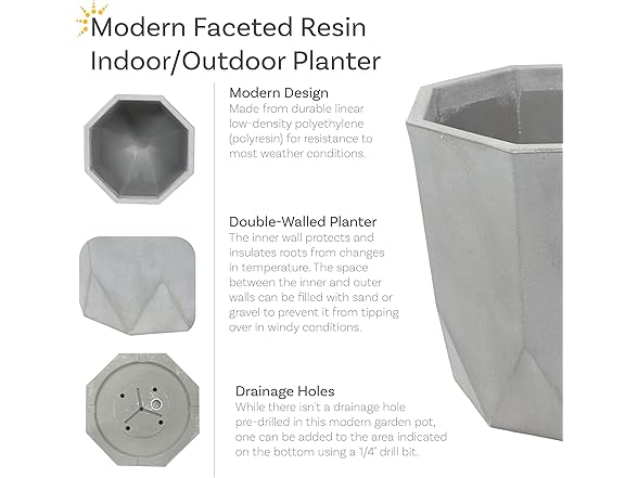 - ENHANCED INSULATION: The full depth of the inner wall protects and insulates roots from changes in temperature without sacrificing soil capacity. The octagonal planter pot's outer wall can be filled with gravel or sand to weigh it down to withstand windy conditions. Remove the plug at the bottom of the planter to fill the outer wall.