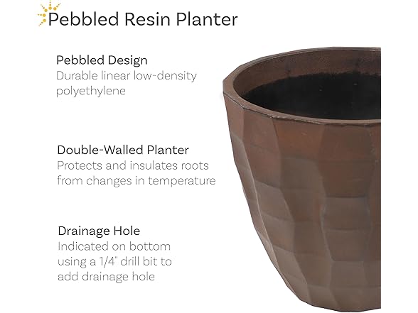 Grow flowers, greenery, herbs, or vegetables in any indoor or outdoor area with this versatile planter. This 15.75" round planter can hold up to 0.68 cu ft of soil, ensuring plenty of growing space for root systems to develop. Made from durable and weather-resistant linear low-density polyethylene (polyresin), this modern planter pot boasts a unique blend of strength and beauty. The modern, pebbled design and neutral color complement any environment, including the living room, patio, sunroom, or garden. With its lightweight construction, moving plants from room to room or repositioning them in the garden is a breeze. Better control water intake by drilling drainage holes in the bottom of the planter at the pre-determined markers. Drainage holes ensure plants thrive by preventing overwatering and root rot, whether the planter is used for growing vibrant indoor herbs or lush outdoor blooms. Be sure to place a saucer beneath the round planter pot if drainage holes are added to prevent water from spilling.