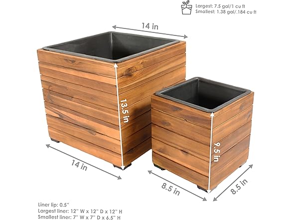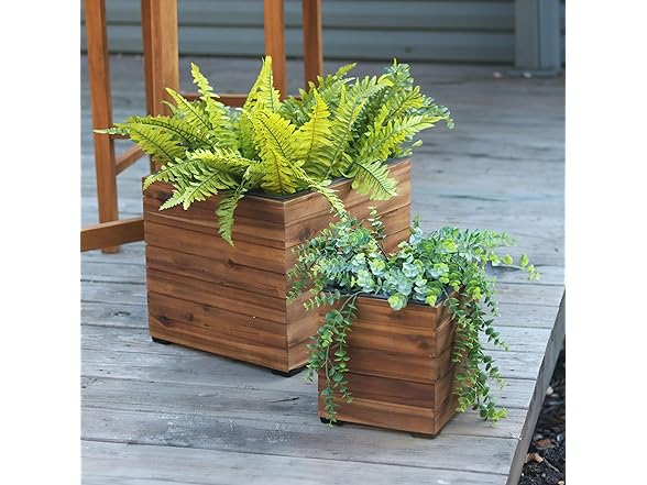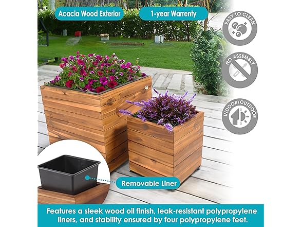Welcome guests with beautiful blooms or thriving greens in this outdoor square planter set. Place the planters on the front step, patio, deck, walkway, backyard, or set them in the living room or sunroom indoors. This outdoor planter set of 2 is made from acacia wood for a natural look and is finished with a smooth wood oil for added beauty. The plant boxes are designed to be used both indoors and outdoors. Never worry about soil or water leaking from the planter with the drainage hole-free polypropylene liner inside the planter. Because the planter does not have drainage holes, water plants carefully to prevent overwatering and consider placing them in a location that receives little rainfall. Each planter box has four polypropylene feet on the bottom to ensure stability on any flat surface. These planters do not require any assembly; just pull them out of the box and fill them with soil to begin growing flowers or plants!