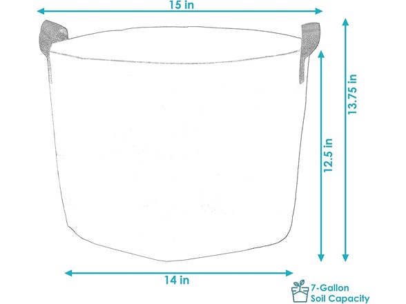 - 7-Gallon Capacity: The container portion of each garden grow bag is 14" Diameter x 12.5" H. Overall, the grow bag is 15" W (from handle to handle) x 13.75" H (from ground to handle) and weighs 4.45 oz. or 126 grams. It has a soil capacity of 7 gallons (additional units of measurement: 1.11 cubic feet; 33 quarts; and 1066 ounces). This fabric pot is versatile and perfect for starting your seedlings or repotting a fully grown plant.