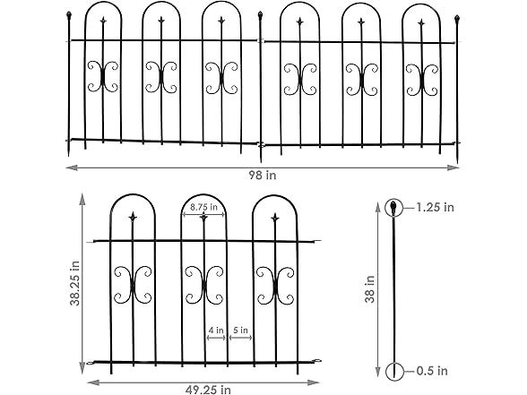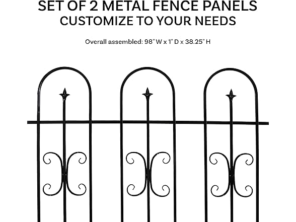 - CONVENIENT SIZE: Two panels combine for a total width of 98", offering a practical way to define and decorate larger outdoor spaces. Each metal garden fence panel measures 49.25" W x 1" D x 38.25" H. Each fence post measures 1.25" thick on top (0.5" on bottom) x 38" tall. The set weighs 22 lbs.
