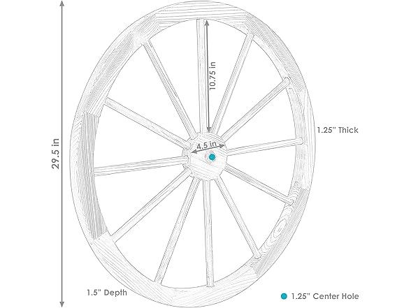 - ADDS COUNTRY CHARM: This wagon wheel decoration measures 29.5 inches diameter x 1.5 inches deep and weighs 4.5 pounds. The spokes are 10.75 inches long. The center hole is 1.25 inches diameter. The central hub is 4.5 inches diameter. It has the appearance of an antique wood wagon wheel from a barn or farm and is perfect for adding a touch of rustic charm to the backyard.