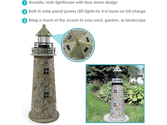 - SOLAR-POWERED ILLUMINATION: Use the solar lighthouse outdoors to light up the garden. Solar panels on top of the statue charge in direct sunlight and power an LED light in the top of the lighthouse that stays on for 4–6 hours (on a full charge) after sunset.