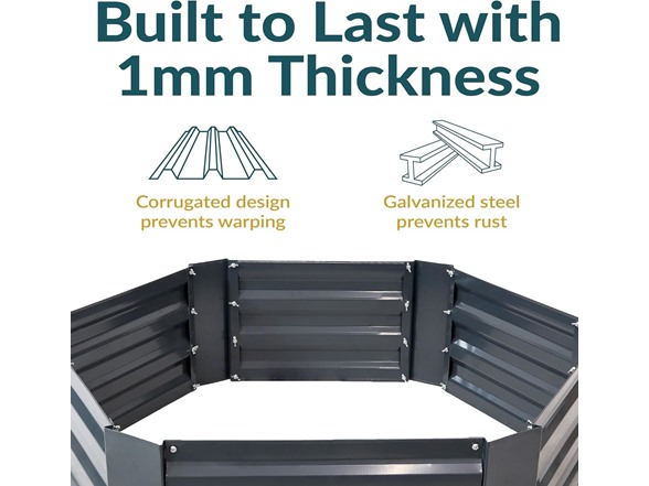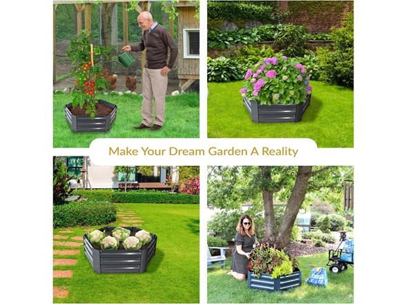 Grow your favorite vegetables, plants, flowers, and herbs with ease in your garden or yard with this raised garden bed. This garden bed is sure to add height and health to any plant garden space with extra capacity for soil and growth. Raised garden beds provide plants with better soil and moisture drainage to produce a higher yield! This raised bed is made from 1 millimeter tick galvanized steel to withstand most weather conditions and prevent rust. This bed won't crack in freezing conditions. In addition, this bed garden bed comes complete with everything necessary for assembly, including the steel panels, hardware, and installation instructions. Available in multiple colors and sizes, with this garden bed, you can create the garden of your dreams. Place many of these throughout your yard to implement a grand garden, or just place one outside of your kitchen window or beside the deck for easy access to herbs, vegetables, or beautiful blooms.