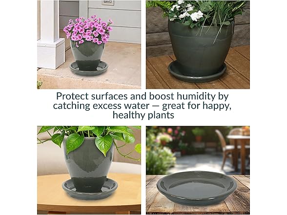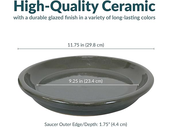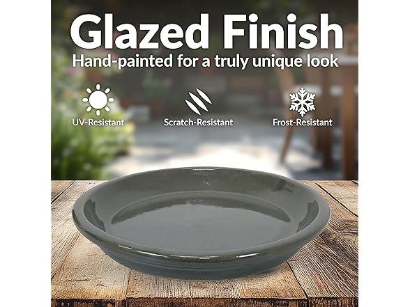 - DESIGNED FOR BEAUTY AND STRENGTH: These ceramic plant dishes are hand-painted with a rich, glazed finish and placed in a kiln for classic, shining beauty. Please note, variations in color may occur due to manual glazing and the unique kiln firing process. The glazed finish also protects the saucer in most weather conditions for lasting use.