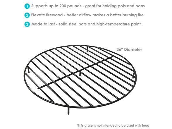Improve the flame of your fire with this round fire pit wood grate. Set this fire pit wood grate into the bottom of a fire pit to place firewood on top of, which allows air to flow underneath the grate for better fires and cooking. Also, the durable steel construction with high-temperature and heat-resistant finish ensures your fire pit wood grate will give you many years of performance. Note that this is not a cooking grate and food is not meant to be place on top.