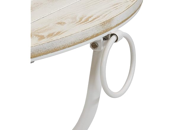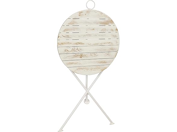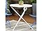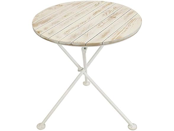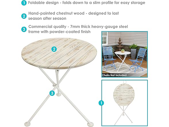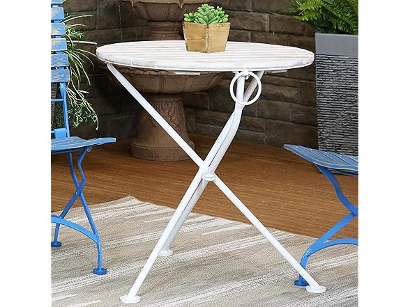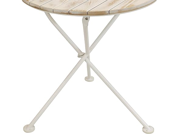 Bring the charm and elegance of a local cafe to the patio, deck, sunroom, or porch with this stylish bistro table featuring beautiful chestnut wood construction and a foldable design. The legs are coated white, and the wooden, circular tabletop has a light brown stained finish. This portable, outdoor table is great for eating meals, chatting with friends and family, or enjoying game nights together. This table makes for a great party or card table! It features a beautiful chestnut wood tabletop for a sophisticated look and has natural resistance to elements with a 7 mm thick, black, powder-coated steel frame for long-lasting durability. The steel and wood materials are durable and lightweight, making it easy for you to setup, fold, take down, move, and store this table. This portable table easily folds up and features plastic foot cover glides so moving it from place to place is simple. Take it outside while camping or fold it up and tuck it into the closet for off-season storage.