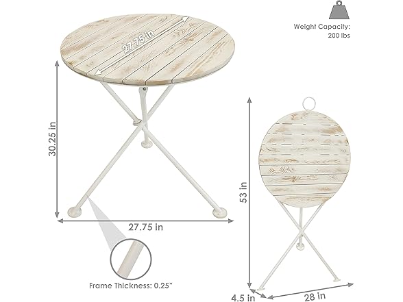 - COMPACT PATIO TABLE: This table measures 27.75" in diameter x 30.25" H and weighs 20.2 lbs. It has a weight capacity of 200 lbs. This folding bistro table is a wonderful addition to the patio, balcony or dining room. It's great for playing cards or boardgames, enjoying delicious food, or gathering with friends for a chat.