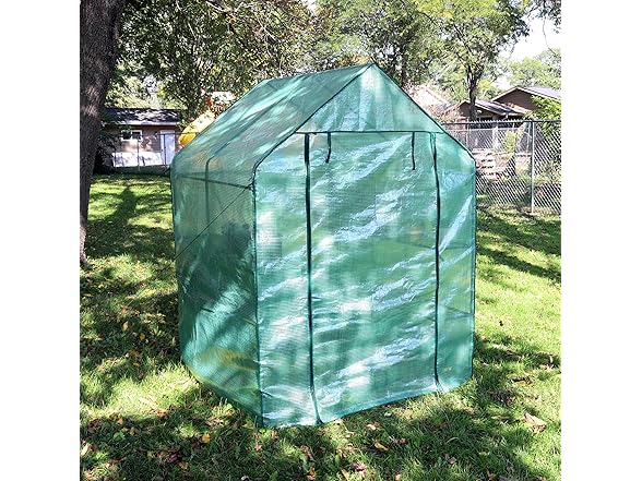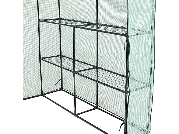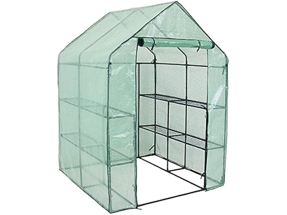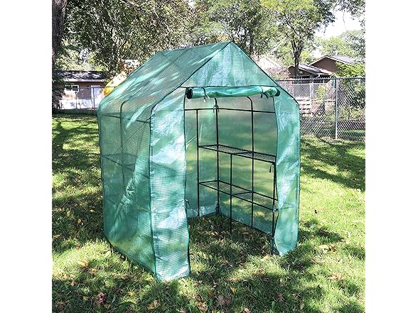 Have a successful growing season this year with help from this portable walk-in greenhouse! With four shelves for growing plants and storing supplies, this small greenhouse for outdoors is great for creating the right growing climate for vegetables, herbs, fruits, and flowers. This greenhouse is durably constructed with an iron tube frame and a polyethylene covering that is coated with a UV ray protective finish. The cover protects plants from inclement weather like frost, excessive heat, and moisture. The cover is transparent so light can filter through to ensure plants receive the right amount of sunlight. This greenhouse features four shelves that are made from steel wire to hold planters and keep supplies close at hand. Store the heaviest planters on the bottom shelf. A roll-up door with zippers allows for controlled airflow in and out of the greenhouse and easy access to plants.