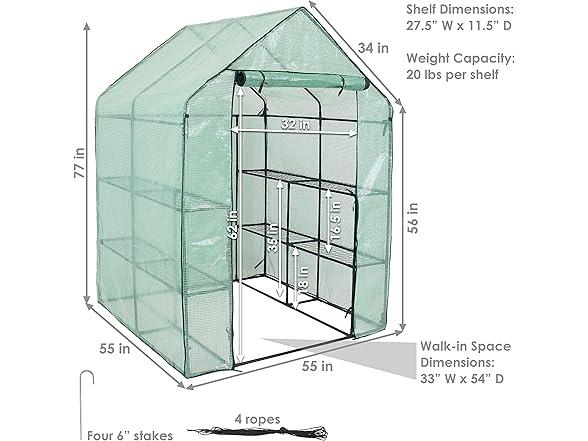 - PORTABLE GREENHOUSE KIT: Move this greenhouse across the yard, patio, or deck easily to ensure plants receive the best sunlight to grow. This walk-in greenhouse measures 55" W x 55" D x 77" H and weighs 17.6 lbs. Each shelf is 27.5" W x 11.5" D and has a weight capacity of 20 lbs. The top shelf is 35" from the ground, and the bottom shelf is 18" from the ground on each side of the hot house. The door measures 32" W x 62" H. The walk-in area of this greenhouse is 33" W x 54" D x 76" H.