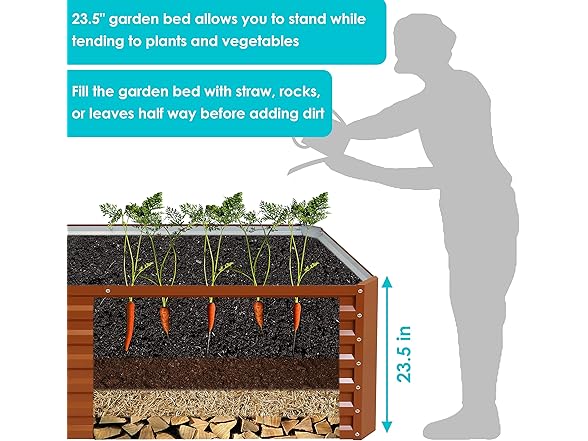 - ERGONOMIC AND EFFICIENT: This large garden bed planter is raised off the ground to reduce bending and strain for a more ergonomic and enjoyable gardening experience. Standing while gardening releases tension on the back and allows for a more comfortable position. Raised garden beds are also good for plants. The elevated design improves soil drainage to reduce the risk of waterlogging. It also keeps soil warmer and less compacted for faster germination and stronger root systems.
