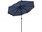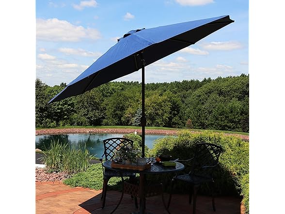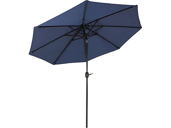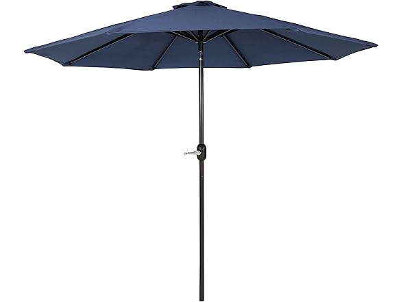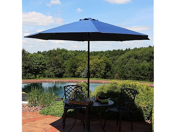 Add bold color and dependable shade to any outdoor setup with this 9-foot market umbrella. Designed for patios, decks, and backyard spaces, the vibrant canopy brings a fresh pop of color while providing reliable sun protection. The spun-polyester fabric resists fading for up to 800 hours and blocks 95% of UV rays, helping maintain its look season after season. A rust-resistant, powder-coated aluminum pole pairs with eight sturdy ribs to support the canopy, while a wind vent at the top promotes airflow and boosts stability during breezy days. The easy-to-use crank handle opens the umbrella smoothly, and a built-in auto tilt function allows the angle of the shade to adjust effortlessly—just keep turning the crank. Sized to cover tables from 42" to 54", it fits most standard bases with a 1.5" diameter pole. Attached fabric ties keep the canopy neatly secured when not in use. Quick, two-piece assembly makes storage and transport simple.