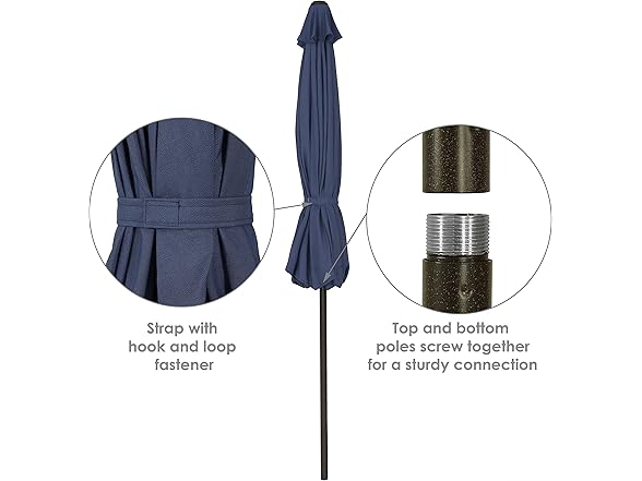 - SPACE-SAVING DESIGN: The outdoor umbrella features a two-piece construction that allows for simple storage and transport when not in use. Tie the canopy closed with the attached fabric ties for a slim profile, and disassemble the two pole pieces by twisting them apart for compact storage. The closed umbrella measures 7" W x 7" D x 54" H.