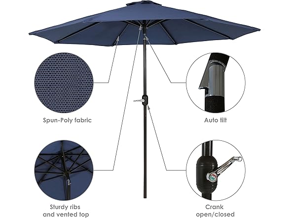 - ADJUSTABLE SUN PROTECTION: The auto-tilt feature lets the canopy angle with a simple crank, providing reliable sun protection throughout the day. Simply continue to crank the handle after opening the shade. The patio table umbrella's crank handle smoothly opens and closes the canopy for quick setup and takedown.