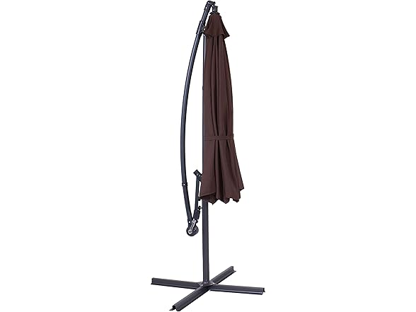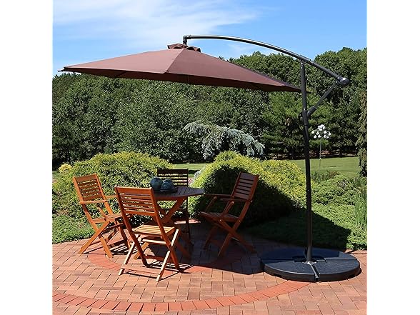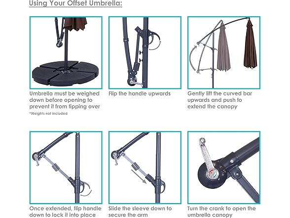 This outdoor offset patio umbrella with cantilever and crank will add refreshing shaded space to any patio, deck, yard, or garden. This offset patio umbrella is great for hanging over outdoor dining tables, hammocks, deep-seated patio furniture sets, and more. Each umbrella has a durable steel pole and 8 steel ribs for extra strength and durability against the elements. The 2 twist knobs on the umbrella pole may be loosened, allowing the center of the umbrella to rotate so the umbrella base does not have to be moved once it has been set in its desired location. The umbrella is made from 100% polyester for extra durability and comfort. The umbrella can be easily weighed down with four 30 lb paving stones or concrete weights. Easily open, tilt, fold up, and store this umbrella! Make sure to fold and tie back in harsh weather conditions for extra longevity.