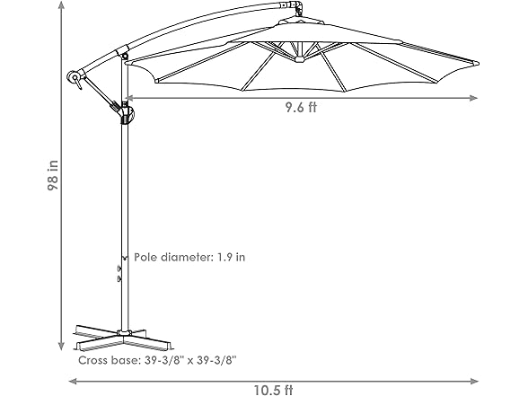- AMPLE OUTDOOR SHADE: This patio offset umbrella measures 135" W x 95" H overall with a 115" diameter shade and features a 2" pole diameter. The cross base measures 40" W x 40" D to help stabilize the umbrella. This outdoor umbrella weighs 28 lbs. Please note, a heavy base is necessary for use (not included). Secure the cross base with 120 lbs. Some options include four 30 lb paving stones or concrete weights (not included) or a heavy-duty water/sand umbrella base (sold separately).