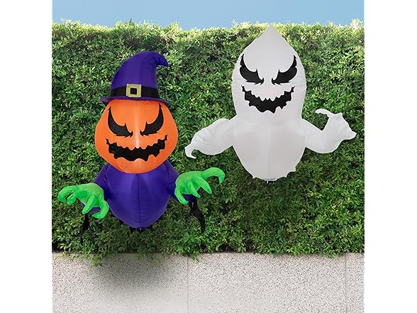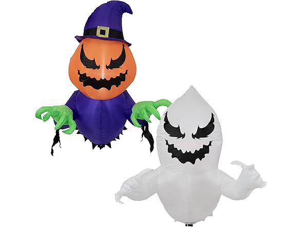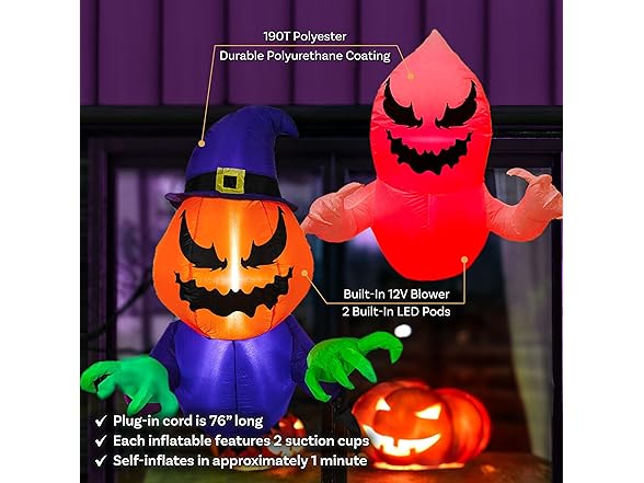 - INDOOR OR OUTDOOR USE: This Halloween inflatable ghost and pumpkin duo is made from 190T polyester with a durable polyurethane coating to resist the elements for indoor or outdoor use.