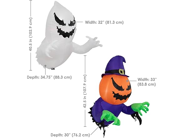 - SPOOKY HALLOWEEN CENTERPIECE: This creepy duo is a fun way to liven up the house for Halloween. Haunted Harold measures 32" W x 34.75" D x 40.5" H and weighs 0.8 lbs. Pumpkin Jack measures 33" W x 30" D x 42.5" H and weighs 0.8 lbs. Each outdoor inflatable Halloween decor piece has a 76" L electrical cord.