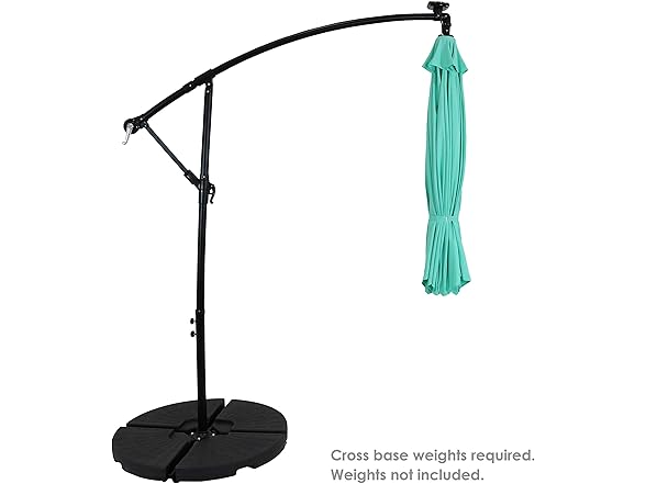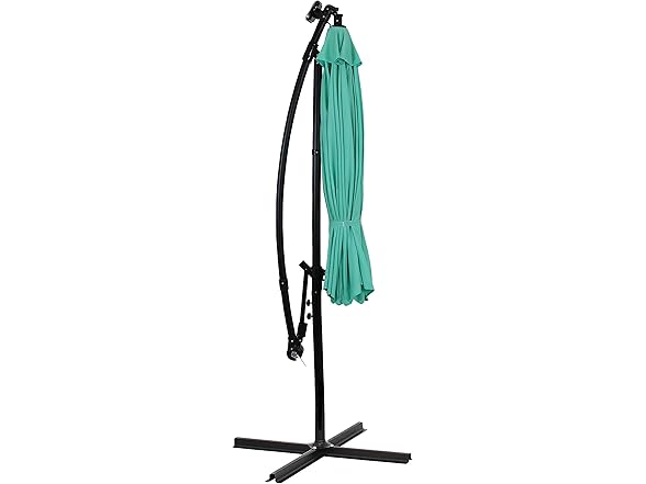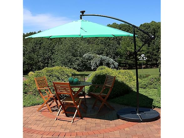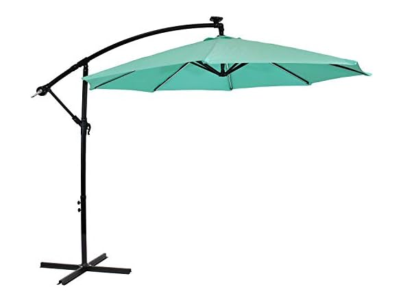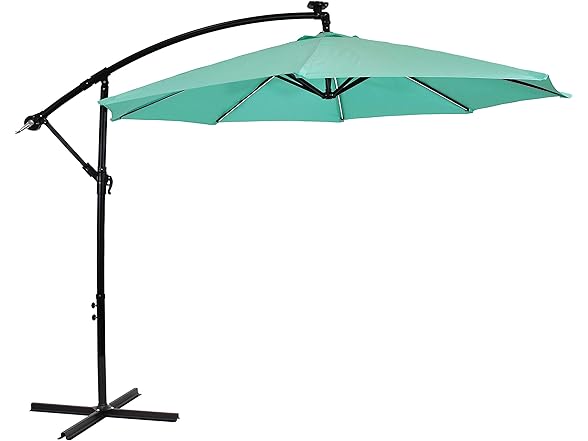 Enjoy shade during the day and gentle illumination in the evening with this outdoor, offset patio umbrella featuring solar LED lights on the inside of the umbrella canopy alongside the steel ribbing. Featuring a polyester umbrella canopy, this cantilever patio umbrella with lights is designed to be strong enough to hold up against the elements year after year. The umbrella is held together by a durable steel base and pole that provide a sturdy frame for resistance to harsh wind. This large cantilever patio umbrella is easy to set up and adjust with the cantilever and crank. Please note, a heavy base is necessary to place on the cross base to keep this offset cantilever umbrella securely in place (a heavy base is not included and must be purchased separately). Available in many colors, get the patio umbrella that best fits any outdoor aesthetic. Easily set up, enjoy the shade during sunny days, and have good conversations with friends all night long!