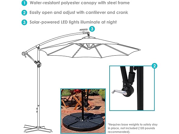 - STRONG MATERIALS: The canopy on this solar patio umbrella is made of durable and water-resistant polyester. The steel pole and cross base provide a strong frame for the umbrella, but it is necessary to use a base weight to properly support it (base is not included). Secure the cross base with paving stones or concrete weights (NOT included) or a heavy-duty water/sand umbrella base (sold separately).