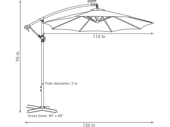 - GREAT FOR THE PATIO: This large patio umbrella with cantilever measures 135" W x 95" H overall with a 115" diameter shade and features a 2" diameter pole. The cross base measures 40" W x 40" D to help stabilize the umbrella. This outdoor umbrella weighs 26 lbs.
