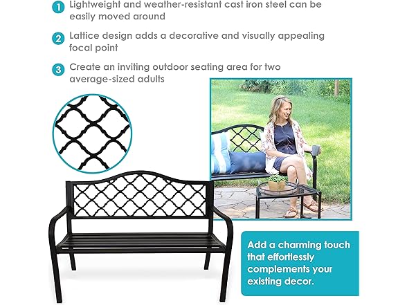 - Durable design: The garden bench is made from heavy-duty cast iron steel material, so it is able to easily hold up to the harsh elements.