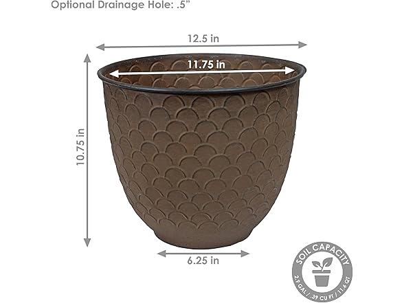 - CONVENIENT MEDIUM PLANTER SIZE: Each outdoor planter pot has a 12.5" top outer diameter (6.25" outer bottom diameter) and has a 10.75" outer height. It has an inner top diameter of 11.75" (6" inner bottom diameter) and has an 10.5" inner height. Each planter weighs 2.8 lbs. It has a soil capacity of 2.9 gallons/0.39 cubic feet/11.6 quarts.