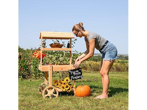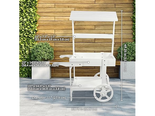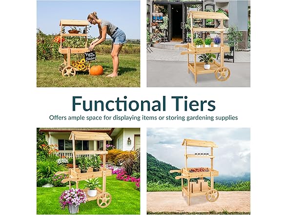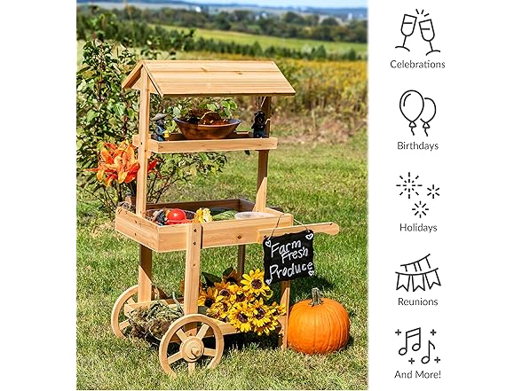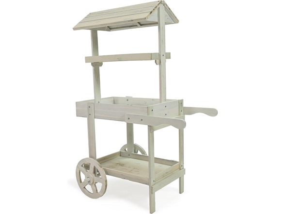 This lovely wheeled garden planter has the appearance of an old-fashioned market stall. It features a sturdy garden flower cart that makes it easy to access the plants and flowers without stooping or squatting as well as an upper and lower shelf for storing gardening supplies like tools and gloves. Each shelf can support up to 10 lbs. This flower stand display cart is made from durable fir wood for lasting strength. It features a stylish wheeled design and handles for a charming look (please note, the wheels and handles are for decorative purposes only. Empty all shelves before attempting to move the cart). All the necessary hardware for assembly is included, a Philips head screwdriver and a wrench is required. This elegant, wood flower cart is a stylish addition to the patio, front porch, or backyard. Plus, it can be used as a wooden candy cart with wheels to hold items for craft fairs and party favors for weddings and other celebrations.