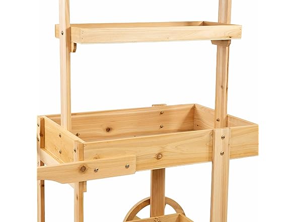 - STURDY 3-TIER DESIGN: This garden planter cart is made from fir wood with a stained finish for lasting strength and beauty. The top tier has 1.02 gal soil capacity (0.137 cu ft). The middle tier has a 2.24 gal soil capacity (0.3 cu ft). The bottom tier has a 1.98 gal soil capacity (0.264 cu ft).