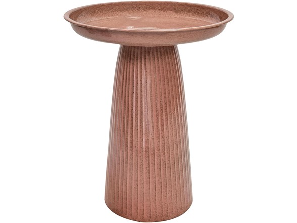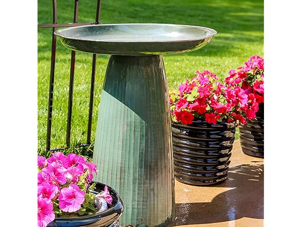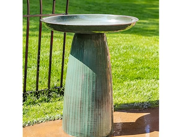Transform the garden into a serene oasis with an exquisite metal birdbath. Crafted with meticulous attention to detail, this shallow bird bath is a true masterpiece of form and function. Its iron construction not only exudes durability but also adds an elegant touch to any outdoor space, creating a focal point that's both inviting and visually stunning. The UV-protected and rust-resistant finish is a testament to its longevity and low-maintenance nature. This means the bird bath for outside will remain vibrant even when exposed to the elements. Assembly is quick and simple with its convenient 2-piece design—just secure the bowl to the pedestal and it’s ready to enjoy. Place the outdoor bird bath bowl in a shaded location to prevent the metal bowl from heating too much in the sun. This bird bath isn't just a decorative addition; it's an open invitation to nature's finest visitors. Birds of all kinds will flock to enjoy a refreshing splash or a leisurely drink, adding a delightful symphony of chirps and colors to any garden. It's a tranquil haven for both feathered friends and garden enthusiasts alike. Let this pedestal bird bath be the centerpiece of any outdoor sanctuary, a place where nature and artistry seamlessly converge.