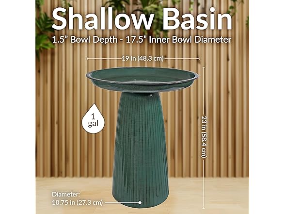 - GREAT SIZE FOR BIRDS: This large bird bath measures 19" diameter x 23" H. The bowl has a 1.5" bowl depth and holds 1 gallon of water. The pedestal has 10.5" diameter base with a hollow 21" inner height. The outdoor bird bath weighs 7.6 lbs for easy placement.