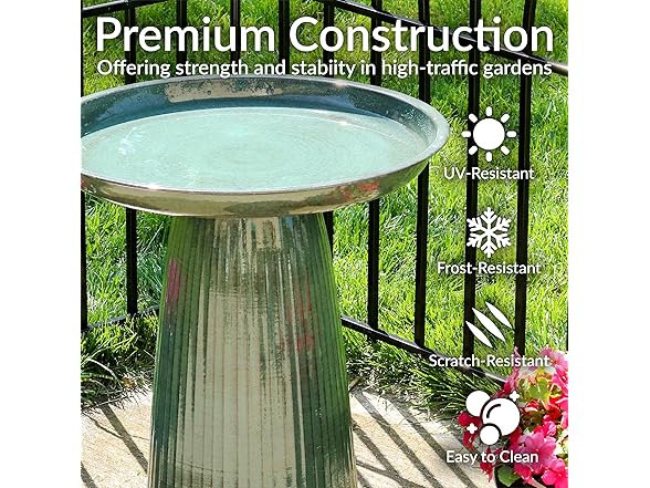 - COMFORT FOR BIRDS AND COMPATIBILITY FOR SURFACES: Shallow bowl design supports safe splashing and feather preening, helping birds stay cool and clean. Place the bird bath securely on grass, soil, stone, or patio surfaces for best results.