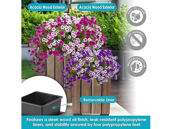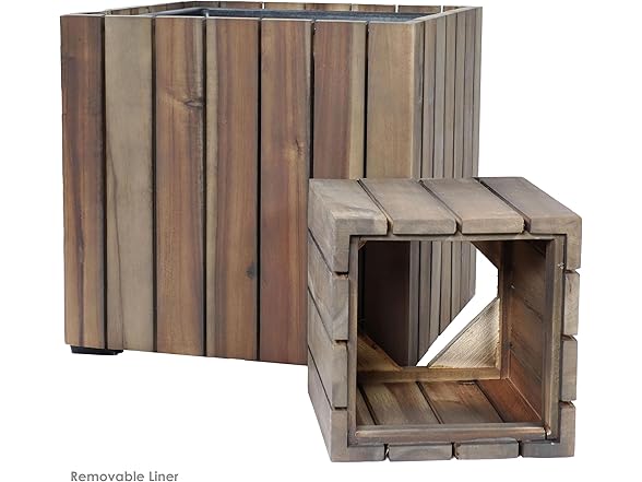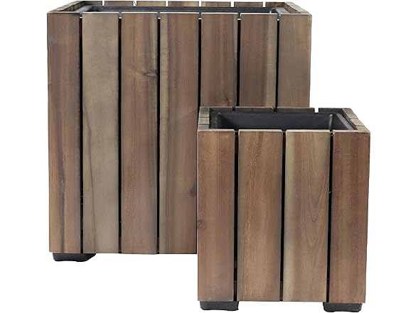 In the Box: (1) Sunnydaze Indoor/Outdoor Wooden Planter Boxes - 2 Acacia Wood Square Plant Pots with Plastic Liners - Anthracite Stain