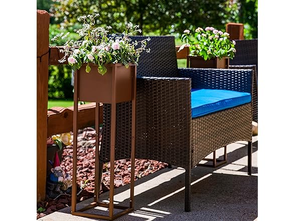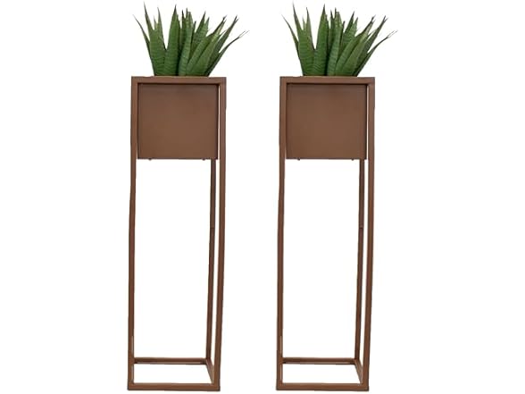 Add a touch of sophistication to any space with this pair of elegant square outdoor planters. Featuring a modern, geometric design, these chic front porch planters are made from cold-rolled steel with a stylish and durable powder-coated finish. These timeless planters are built to last season after season. Choose between two height options, 27 inches and 20 inches tall. They are also available in two classic colors, brown that will complement any decor style. Each planter features four built-in drainage holes that help ensure that the soil is properly drained for improved root health. This set includes 2 planters for a variety of arrangement options. Place them on either side of a door or use them separately anywhere that needs a bit of greenery. These stylish raised garden beds with legs can be used to grow a variety of plants and flowers. They're a contemporary addition to the front porch, backyard, deck, or patio.
