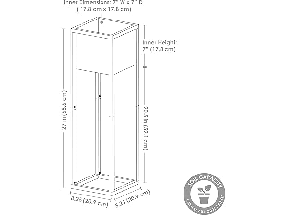 - SPACE-SAVING SOLUTION: Each of the square plant pots measures 8.25" W x 8.25" D x 27" H and weighs 5.2 lbs. The interior dimensions measure 7" W x 7" D x 7" H. The legs measure 20.25" H. It features four 0.25" diameter drainage holes with optional plugs. Each planter has a 1.48-gallon (0.2 cu ft) soil capacity and a 20 lb weight capacity. This set includes two planters.