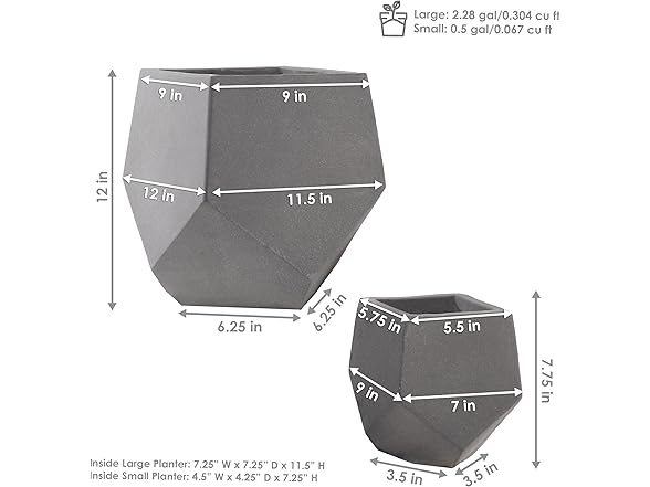 - 2 DIFFERENT SIZES: The large cement plant pot measures 11.5” W x 12” D x 12” H overall and weighs 13 lbs. The planter area measures 7.25” W x 7.25” D x 11.5” H. The soil capacity of the large planter is 2.28 gallons/0.304 cubic feet/291 ounces. The small planter measures 7” W x 9” D x 7.75” H overall and weighs 4.6 lbs. The planter area measures 4.5” W x 4.25” D x 7.25” H. The soil capacity of the small planter is 0.5 gallons/0.067 cubic feet/64 ounces.