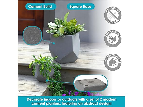 - DURABLE PLANTERS: These abstract modern outdoor planters are made from durable cement to withstand the elements. Each planter has a natural, gray cement finish to match many decor styles.