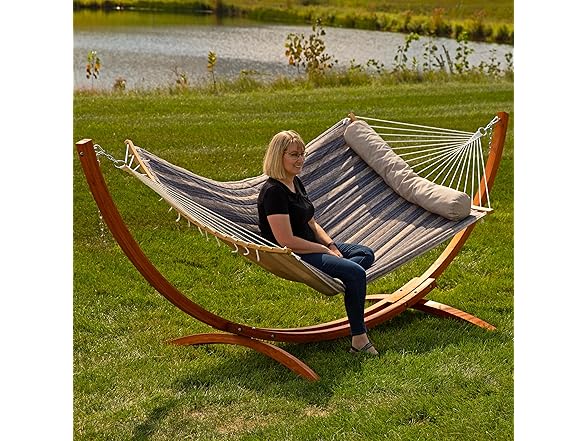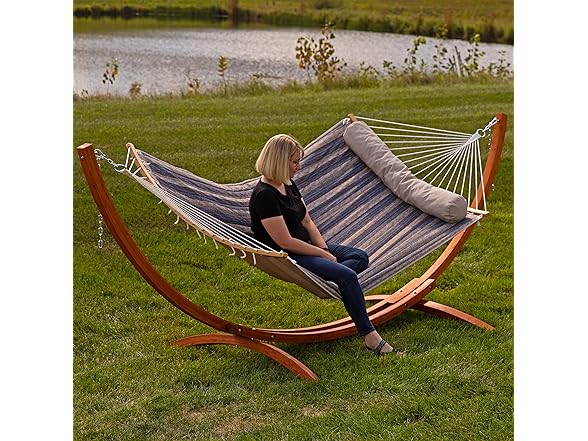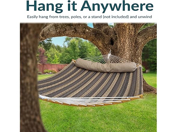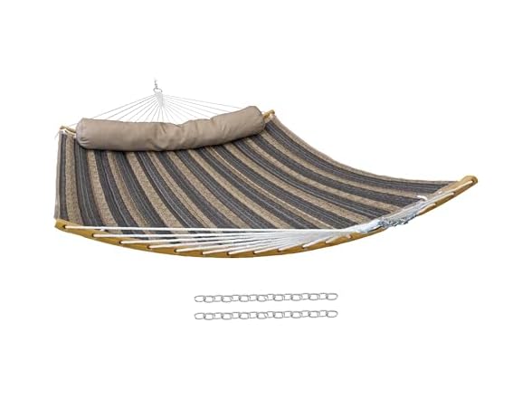 Stretch out and relax in ultimate comfort surrounded by the great outdoors with this quilted hammock featuring curved spreader bars. This hammock features durable polyester fabric and rope for strength, resistance to the outdoor elements, and long-lasting use. Plus, it is easy to keep clean and maintain. This quick dry hammock for outside has strong metal loops to hang the hammock from a stand (please note, a stand is not included and must be purchased separately) or hang it between two trees at a distance between 11' to 15' long. This spreader bar hammock also includes a pillow for extra coziness, comfort, and style. This hammock comes in many colors to match a variety of outdoor aesthetics. Grab a friend, some snacks, a good book, a cold beverage, and get ready to lounge or take a nap to take in the fresh air on warm, sunny days.