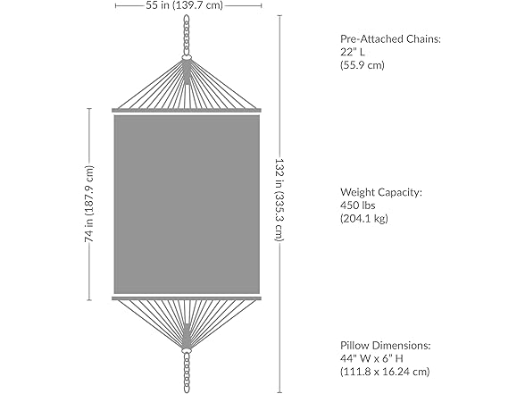 - Room for 2: This 2-person hammock bed measures 74" W x 55" D and weighs 10.2 lbs. The hammock measures 132” W from loop to loop. It can support up to 450 lbs and has enough space to accommodate two adults. The included pillow is 44" W x 6” H.