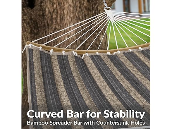 - Comfortable and durable: This quilted hammock is made from polyester fabric with a polyurethane foam fill for added comfort. The curved spreader bars are made from durable bamboo wood. Strong polyester ropes connect the hammock to the metal chains to hang the hammock from a stand (not included) or between trees.