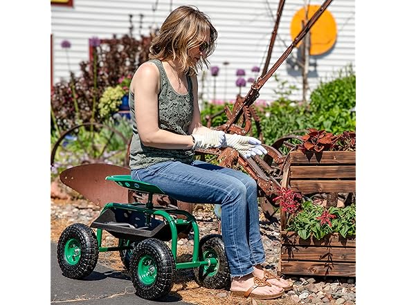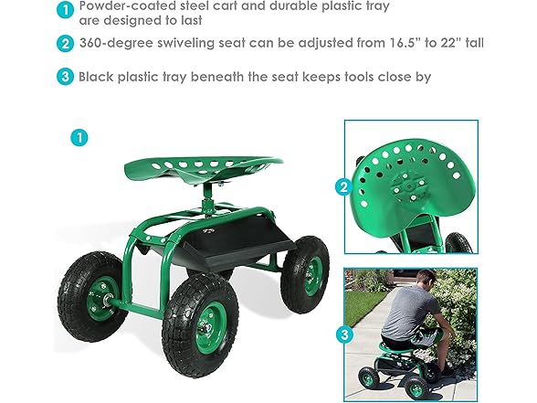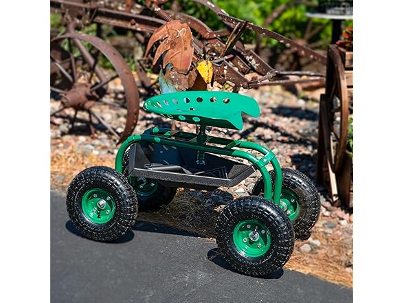 - BUILT TO LAST: Made from heavy-duty powder-coated steel with vibrant color, this cart is built to last. Solid steel axles and heavy-duty pneumatic wheels ensure that the garden chair with wheels will last through many years of gardening and landscaping.