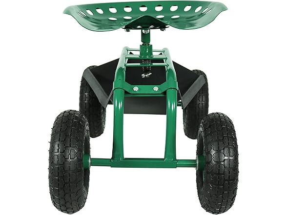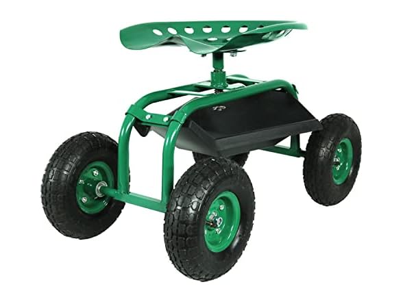 This rolling garden cart features a large, steel seat and an extendable handle that make this garden cart a dream to use while working in the yard. Aside from the convenience, this cart is engineered to last with a heavy-duty, powder-coated steel frame, steel axles, an extendable steel handle, a matching steel wire basket, pneumatic tires with coated rims, and a black plastic tray for holding tools and other convenient items. The seat features a 360-degree swivel motion to face any direction needed to complete the job. Moving this cart is easy too, just pull the cart with the extendable steering handle. Use this handy swivel cart while working in the yard to alleviate back strain or to take a well-deserved seat whenever needed.